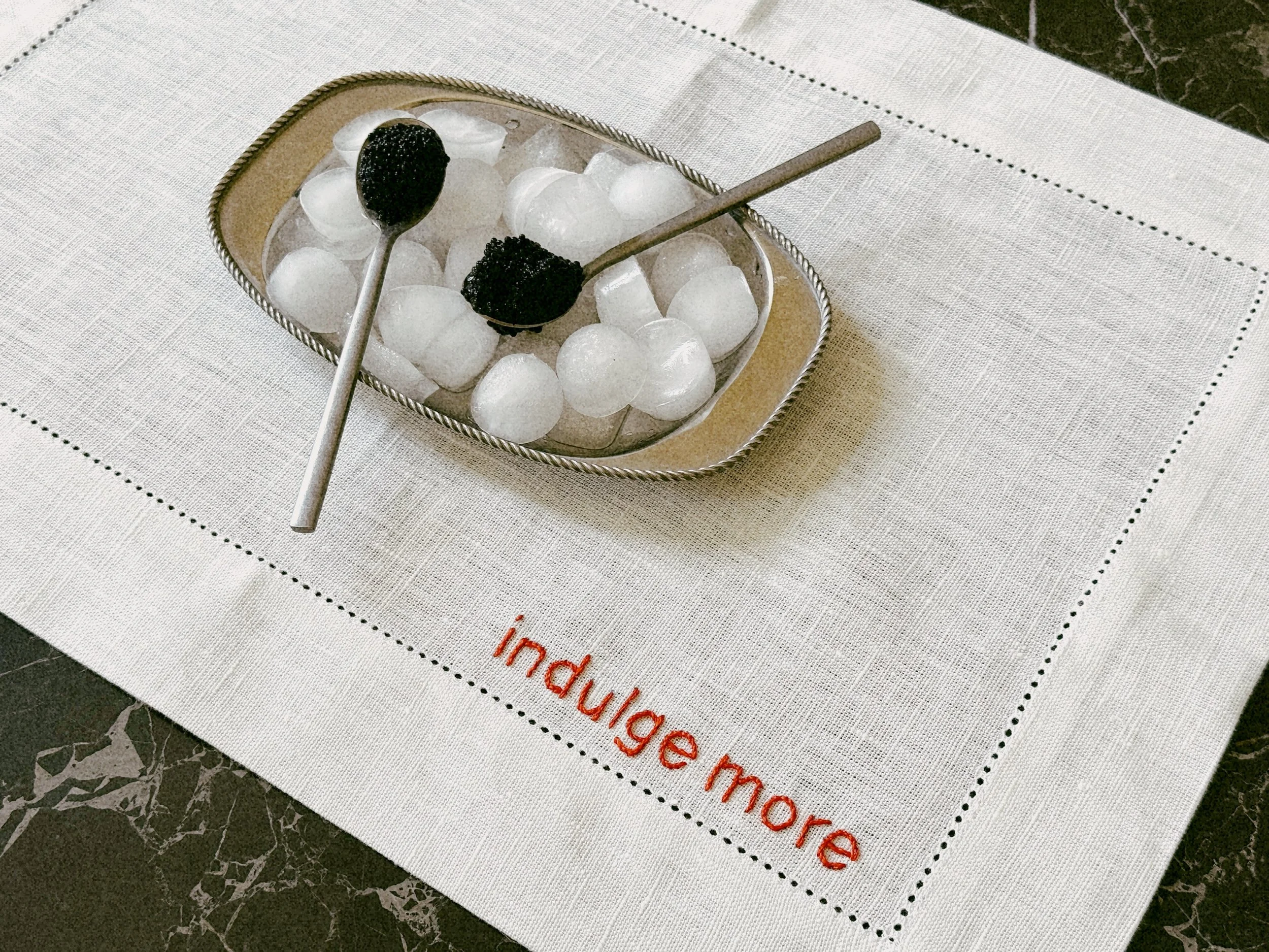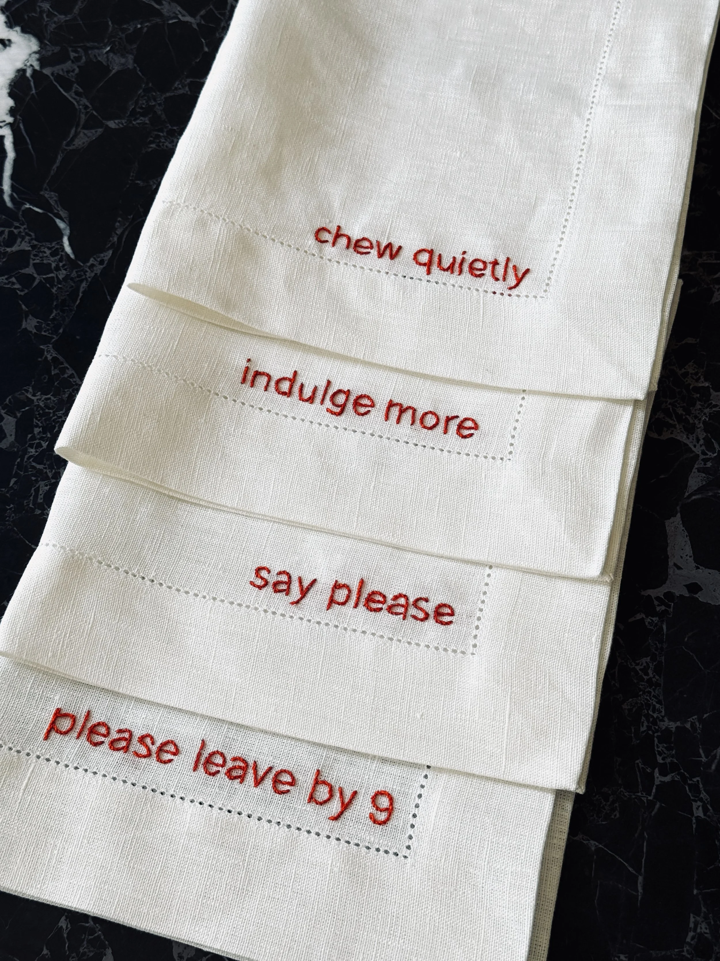 The “Bonton” series brings you placemats crafted from the finest Portuguese linen, adorned with hand-embroidered, witty etiquette-inspired phrases: “please leave by 9”, “say please”, “chew quietly”, “indulge more”.