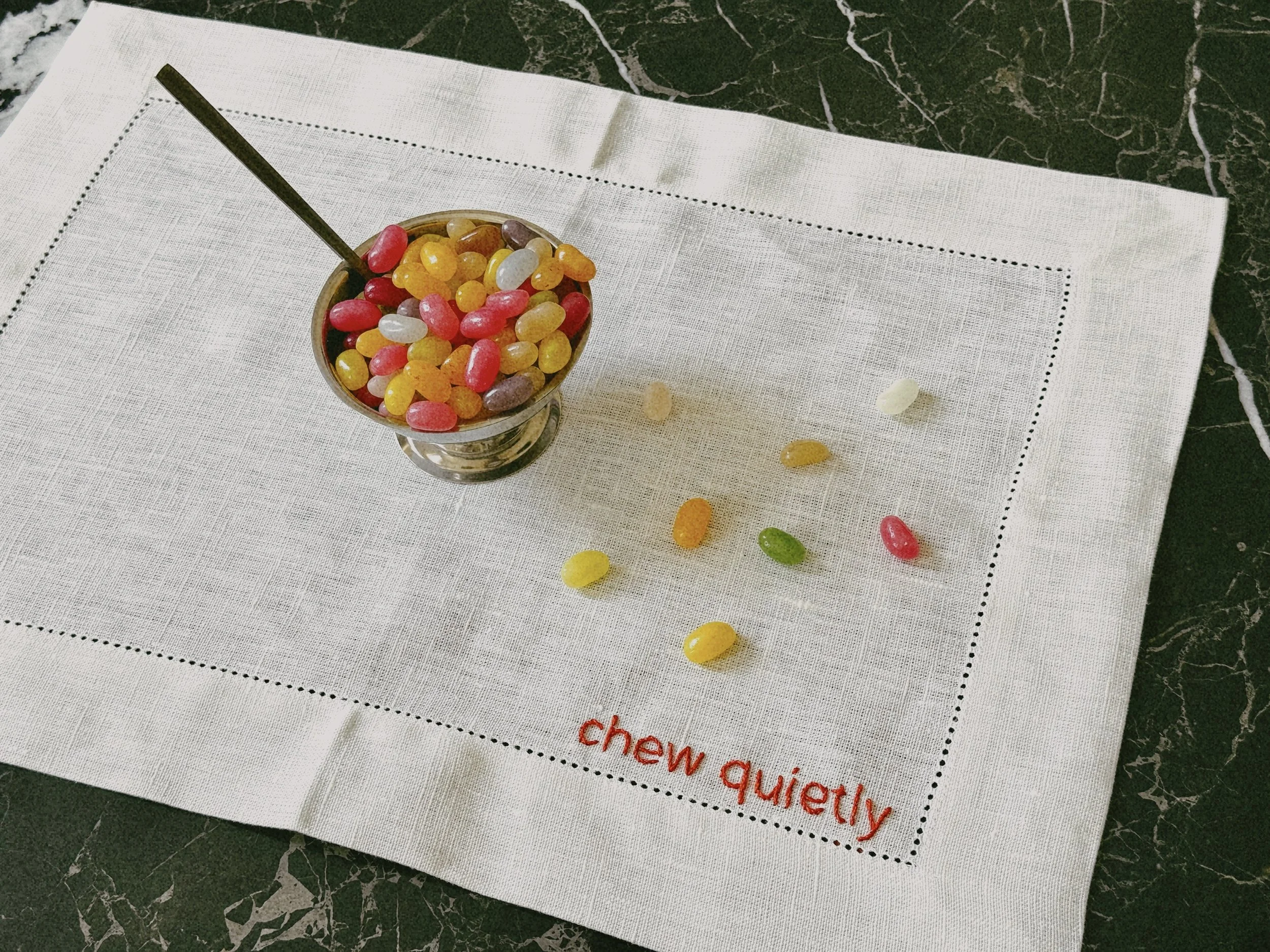 Each placemat is made with meticulous attention to detail – the hand embroidery transforms ordinary expressions into small artistic commentaries on social habits. The natural linen texture and timeless design add elegance to any table setting, while the playful messages bring warmth and humor.